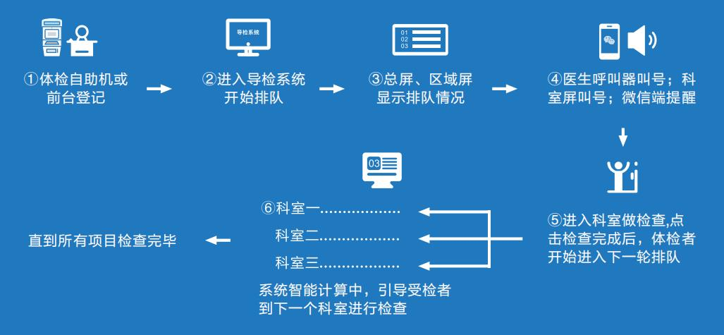 (2)支持登记台提示体检者第一站检查科室到检排队(支持预排瓶颈科室的队列)