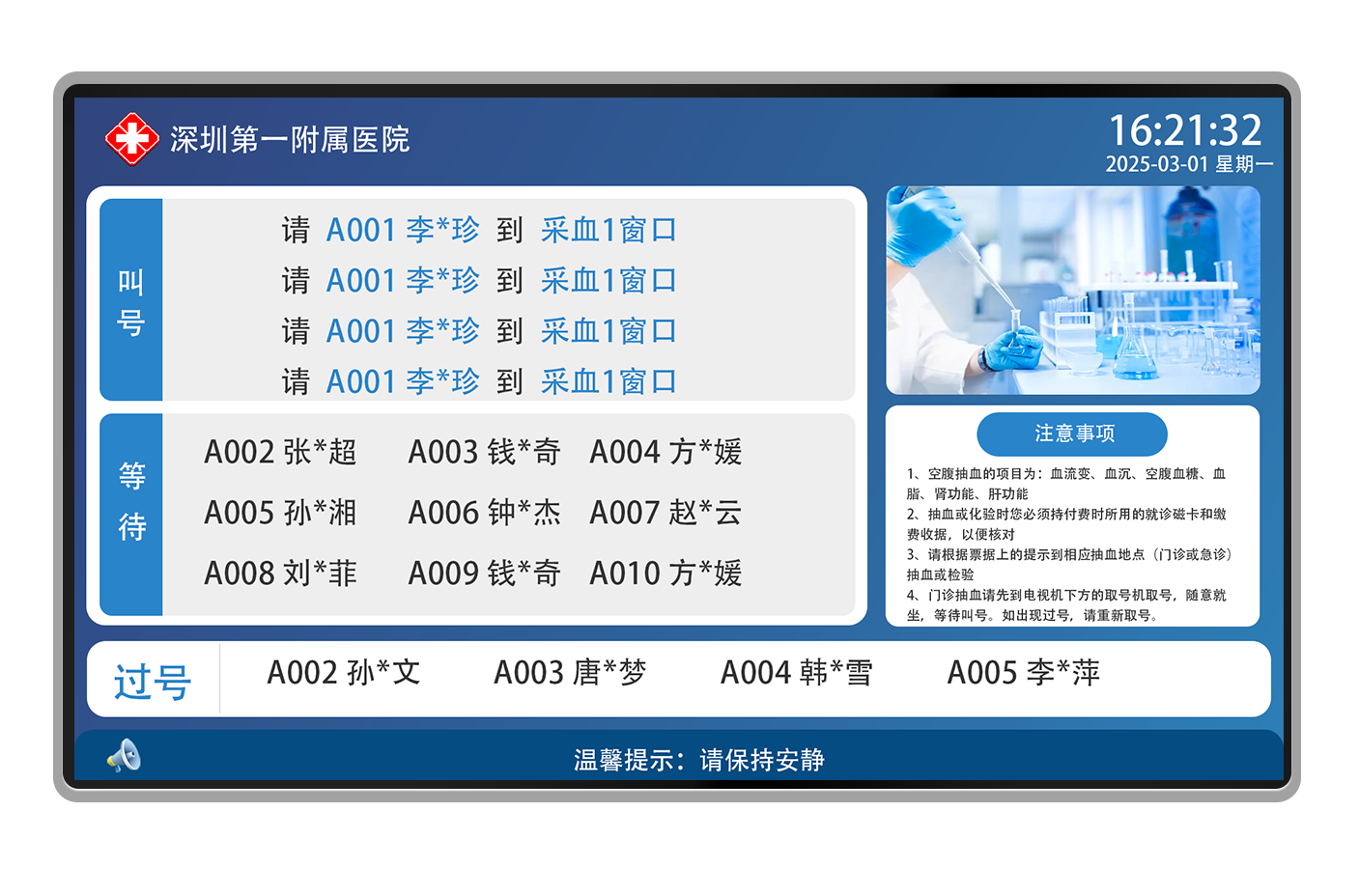 检验化验排队叫号系统多应用于医院的抽血窗口,通过与HIS或LIS系统进行无缝对接,获取患者的基本信息,在患者进行报到后,自动进入抽血排队队列,抽血窗口按照患者报到的顺序进行叫号,窗口屏幕语音响应并显示患者信息。