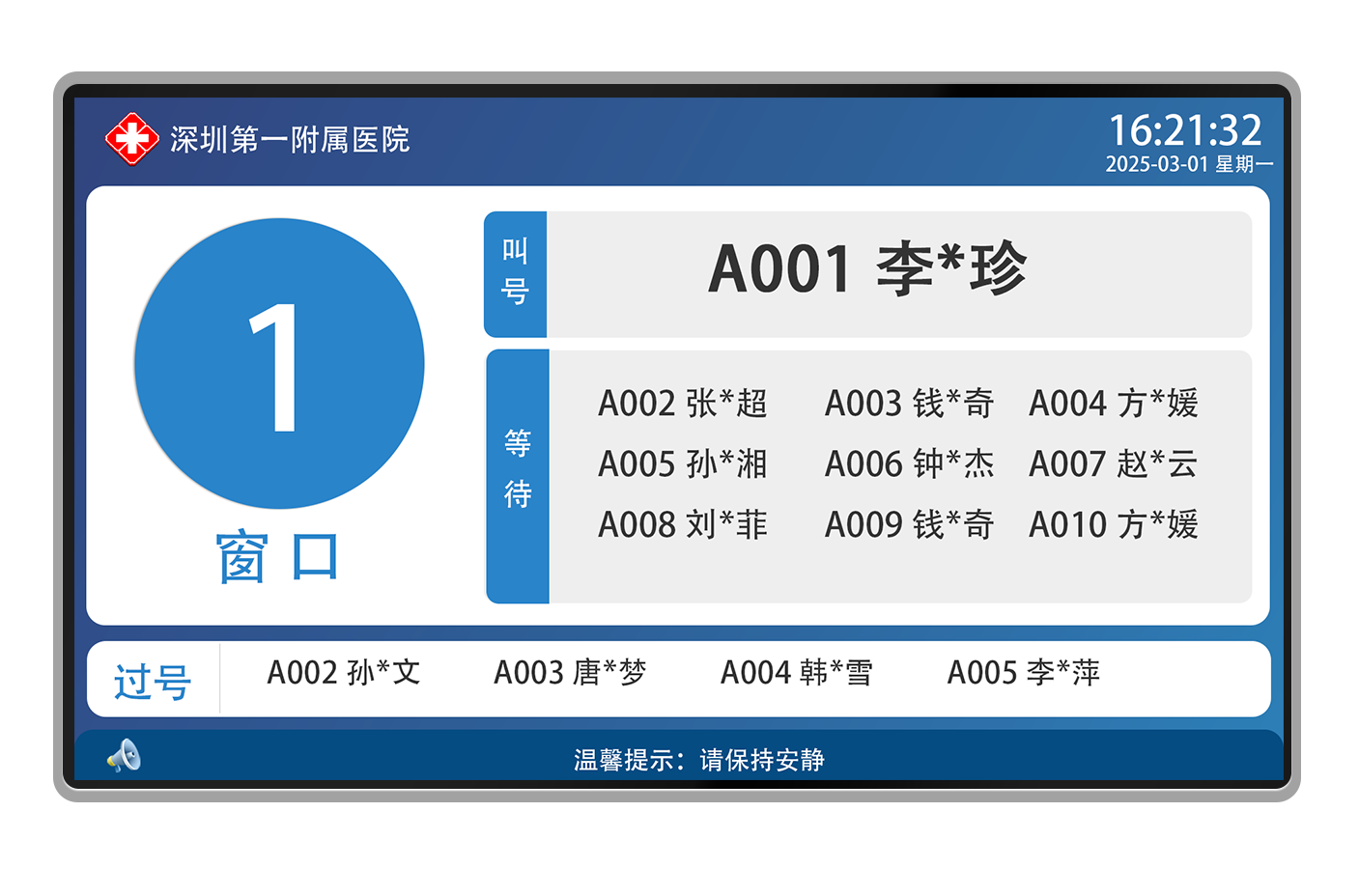 语音提示及液晶屏显示,能让患者按序就诊,减少患者间因排队而产生的矛盾与冲突。