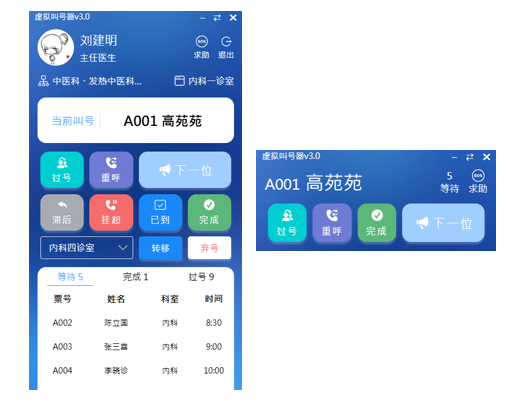 通过医生工作站上的虚拟叫号器软件,实现叫号、完成就诊、选呼、重呼、过号等操作。