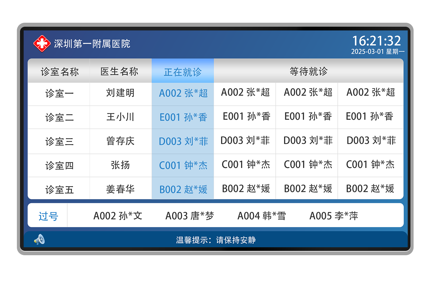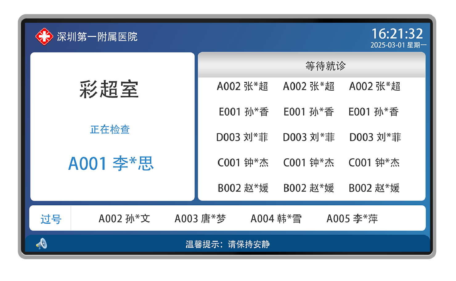 3、可显示科室名称、诊室名称、当前呼叫检查人员姓名与号码、当前等待检查人员姓名与号码、已经检查完成人员下一受检项目和诊室等。