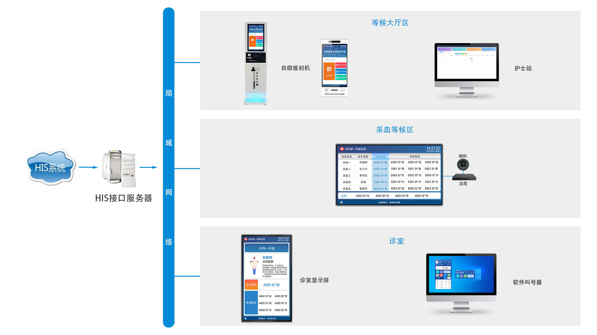 体检排队叫号系统是由体检排队服务管理平台系统、护士导检台管理软件、医生叫号器(包括硬件叫号器和软件叫号器)、综合液晶一体机(候诊区综合显示屏,常规42-65寸)、诊室液晶一体机(医生诊室门口显示屏,常规15.6-22寸),其中将音箱喇叭集成到液晶一体机中,也可以外接功放和音箱。