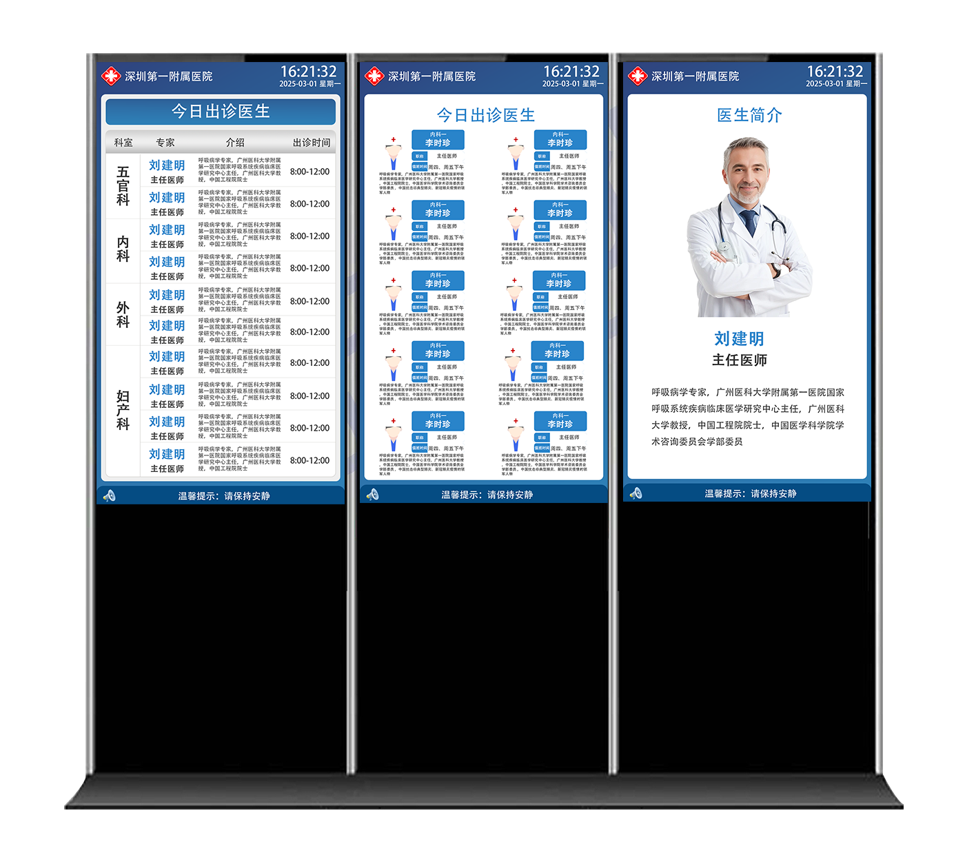 医生排班显示系统采用液晶一体机多屏显示方式,将医生、专家及医护人员等信息全自动显示,内容可以随时更新,患者可通过“专家信息显示屏”实时查询专家详细的出诊信息,并了解专家所剩余的挂号数量。系统是利用计算机对医生、护士进行排班,代替手工排班的应用软件,可快速、自动的产生各科室排班表,不仅速度快、效率高而且公平公正,此系统可布置在医院的挂号大厅、门诊候诊区、各楼梯口,起到提示患者,疏散人流,改善就医环境的作用。