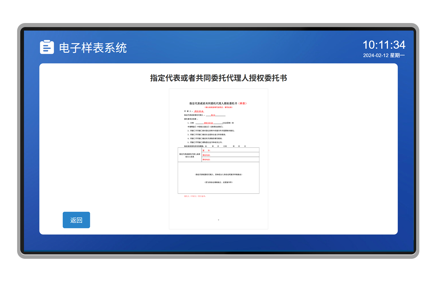 智能样表展示软件主要为办事人员提供范例表单查询参照,当办事人员需要填写表单时,可在对应的电子范例设备上进行表单范例查找,然后对照电子范例样单进行填写尽可,可有效的避免填写错误,从而达到缩短业务办事时间、提高窗口办事效率的目的。