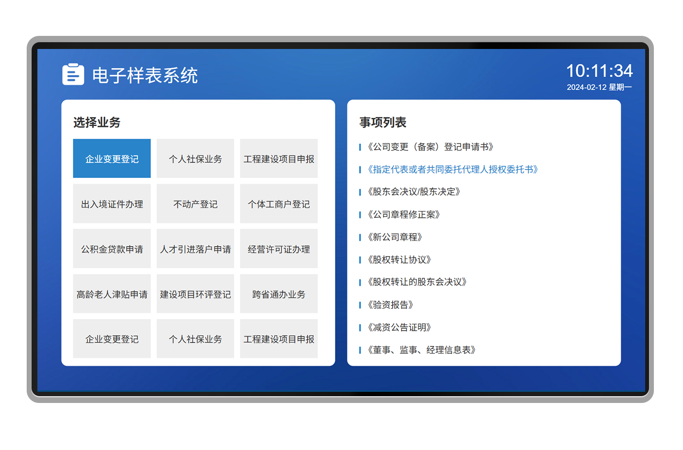 智能样表展示系统可优化填单台布局,解决表单浪费、杂乱无序及填单台空间有限的弊端,有效增强服务大厅的科技感,提升政府信息化水平和政府为民、便民、利民形象。